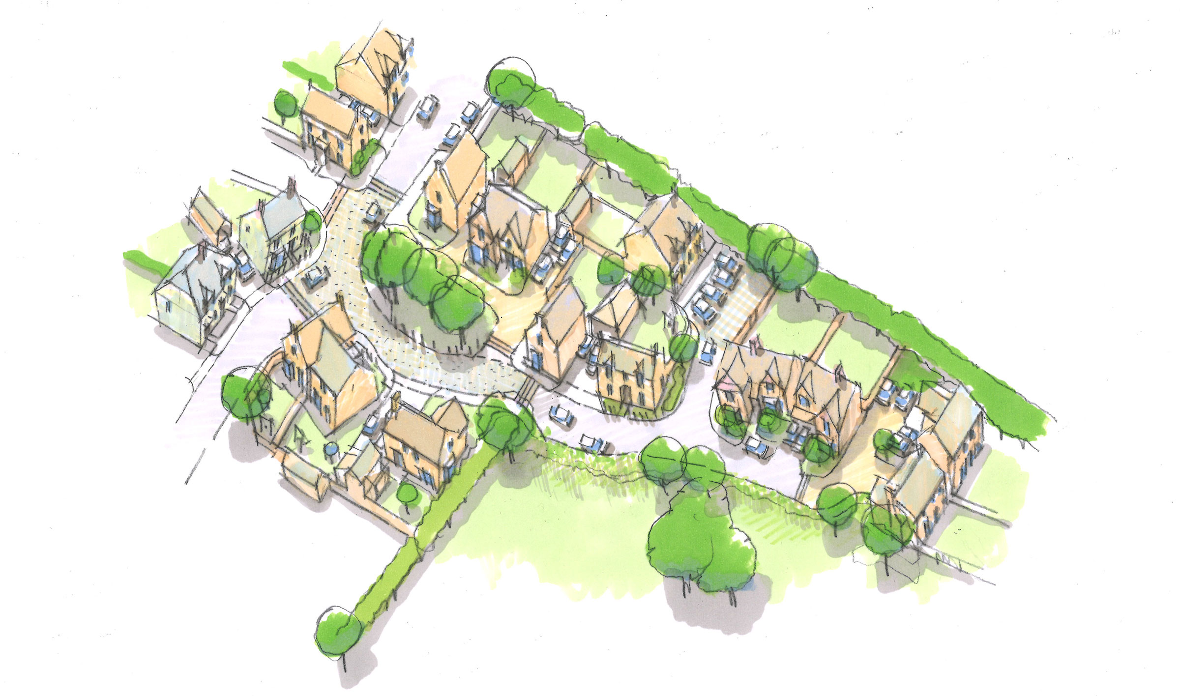 - Landscape-led development which retains existing natural features and introduces new planting and green spaces.